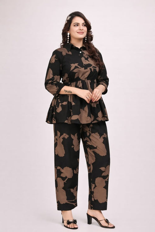 Botanical Print Crepe Co-Ord Set in Black & Sand
